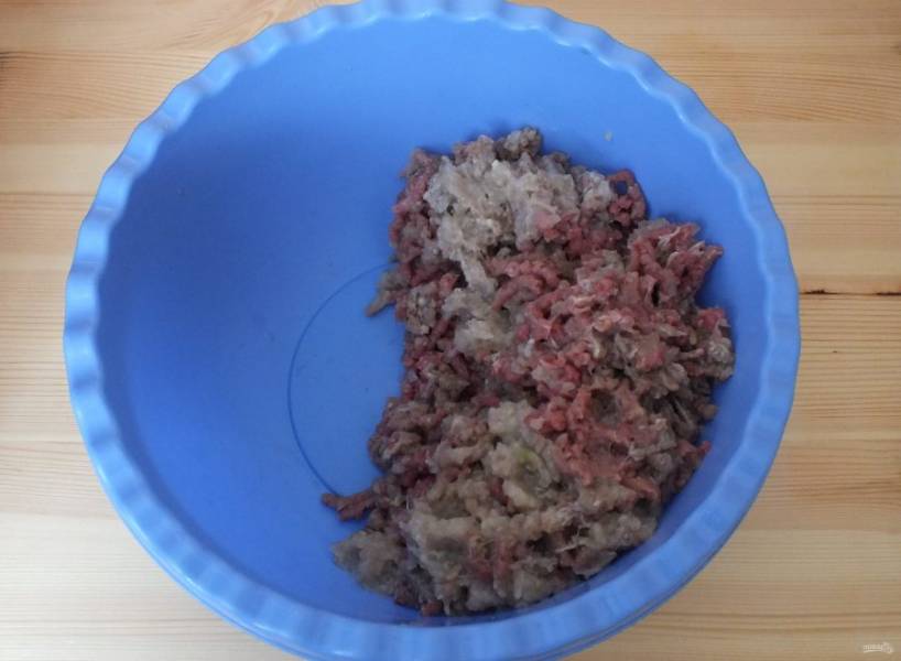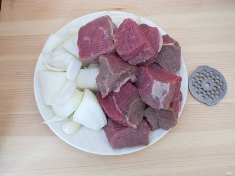 Лук и говядину нарежьте средними кусками. Возьмите мясорубку. Для измельчения этих продуктов, нам понадобиться решетка со средними отверстиями.