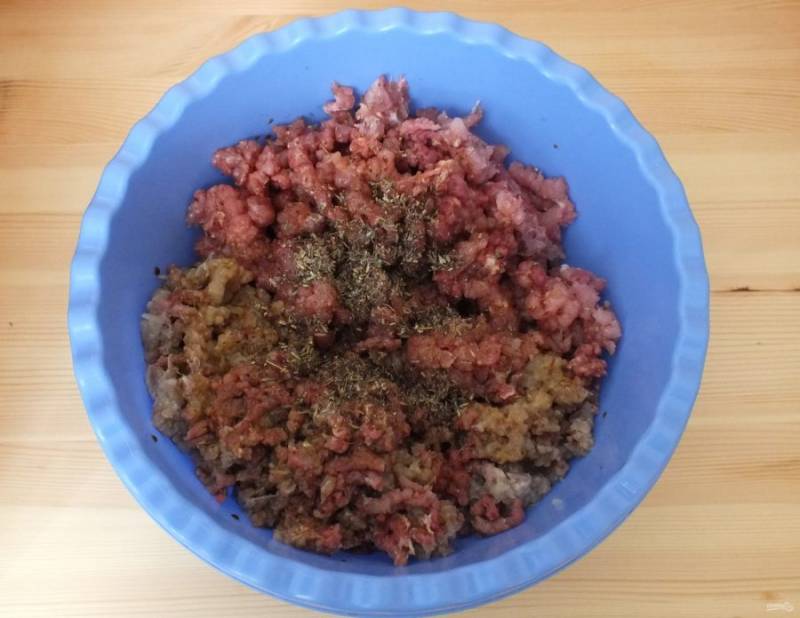 В чаше смешайте фарш со специями, соевым соусом, черным перцем и измельченным чесноком. Уберите фарш в холодильник на 3 часа, можно убрать фарш на ночь.