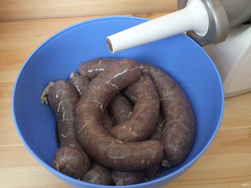 Достаньте фарш из холодильника и частями подавайте в горловину мясорубки, проталкивая. Тем самым набивая черева фаршем. Длину колбасок формируйте по желанию, наблюдайте, чтобы не было пустот. Колбаски готовы к обжариванию. Часть можно заморозить.