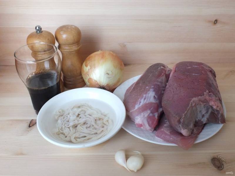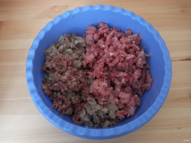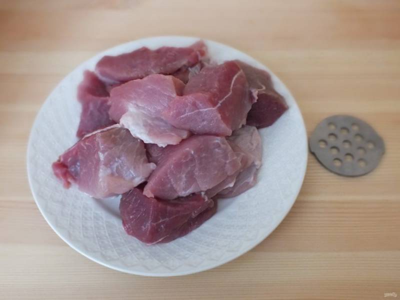 Свинину нарежьте кусками. Для ее прокрутки потребуется решетка с крупными отверстиями.