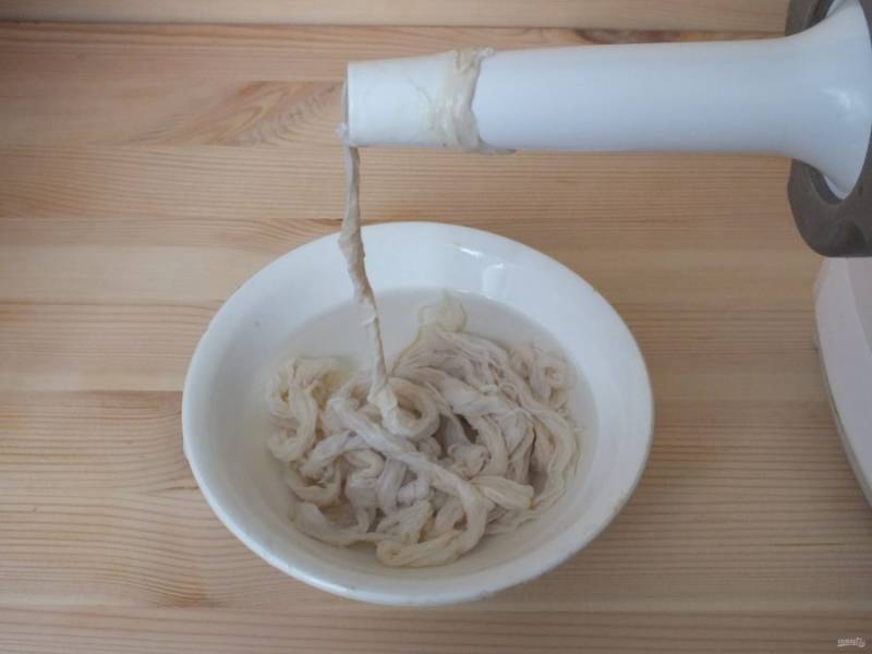 Для набивки колбасок нам потребуется насадка. Аккуратно натяните черева на трубку, не вытаскивая их из воды.