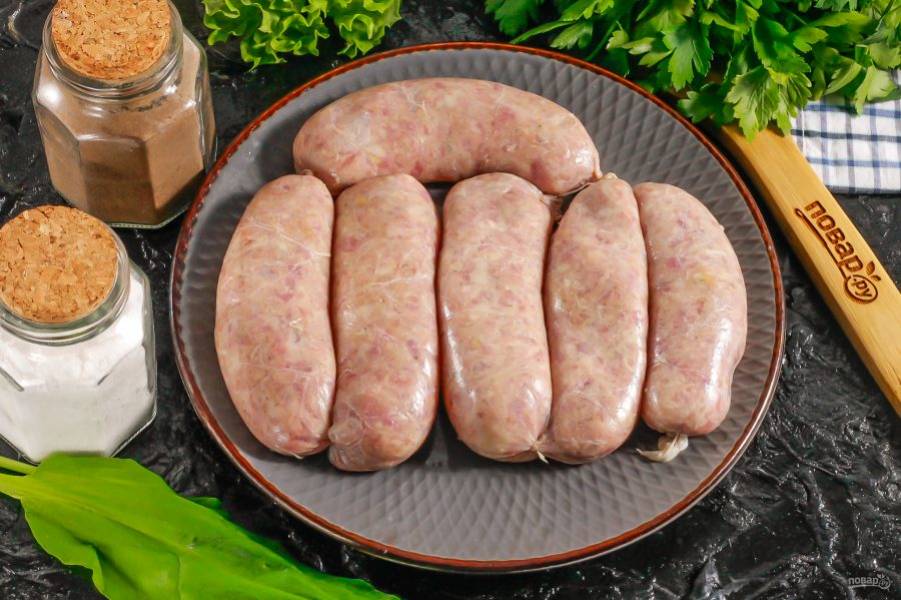 Затем колбасу разделите на части, перевязывая нитью, чтобы получились сосиски. В таком виде поместите заготовки в холодильник, накрыв пищевой пленкой. Фарш внутри заготовок утрамбуется, приобретет ароматы и вкусы специй.