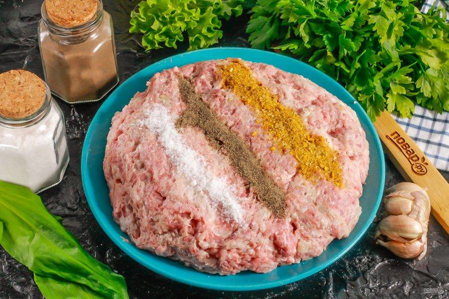 Пропустите мясо, лук и чеснок через мясорубку, установив насадку с крупными ячейками. Вымешайте фарш и добавьте в него соль, молотый черный перец и приправу для мяса. Если готовите колбаски для взрослых, то добавьте в них 2-3 щепотки молотого острого красного перца.