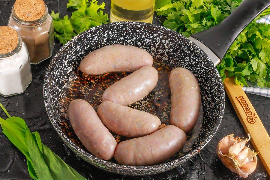 Спустя указанное время извлеките колбаски из холодильника и дайте им примерно 1-2 часа прогреться при комнатной температуре. Можно просто в охлажденном виде взять их с собой на природу. В сковороде раскалите растительное масло и обжарьте в нем колбаски примерно 7-10 минут до румяности.