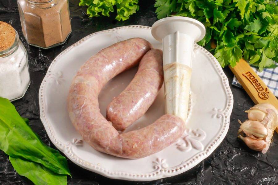 Насадите промытую кишку на специальную насадку или на срезанное горлышко пластиковой бутылки. Завяжите конец кишки нитью и пробейте иголкой, чтобы выходил воздух. Наполните кишку фаршем, но не слишком плотно, чтобы она не лопнула при жарке. Зазоры с воздухом прокалывайте иголкой.