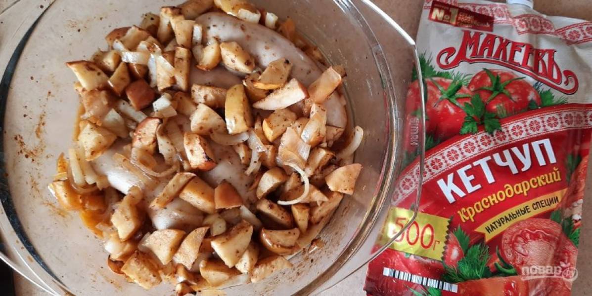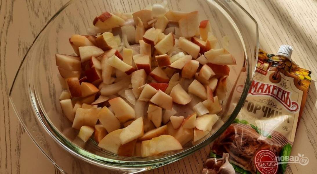 Яблоки порезать крупными кубиками. Кожуру чистить не надо. Лук порезать полукольцами. Выложить колбаски в форму. Яблоки и лук распределить между колбасками. Немного посолить и поперчить.