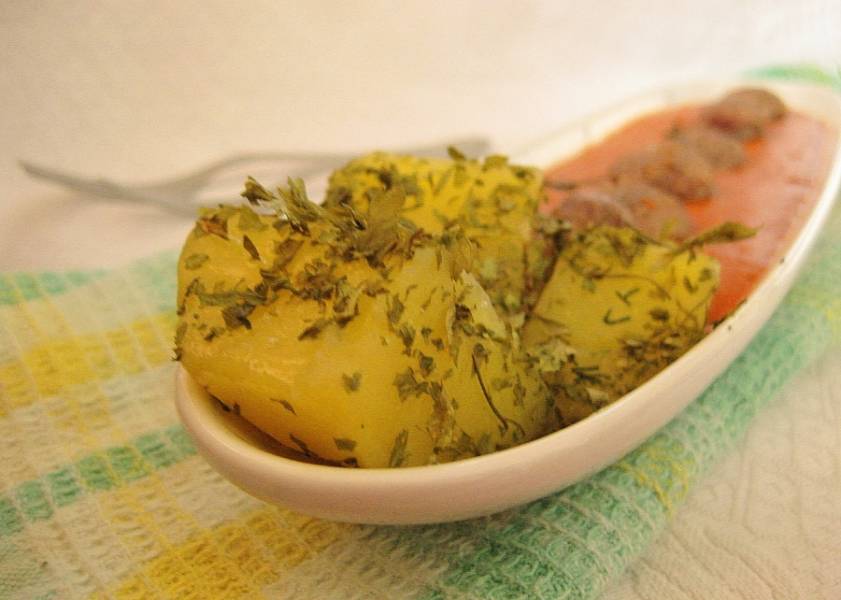 Зелень мелко нарезать. Готовый картофель обмакнуть в растопленное сливочное масло (можно использовать растительное масло) и обвалять в зелени. На тарелку выложить колбаски с соусом и картофель.