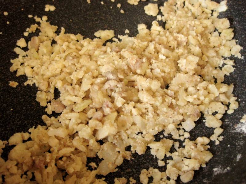 На образовавшемся от колбасок жире обжарить измельченный лук в течение минуты. Добавить муку и спассеровать.