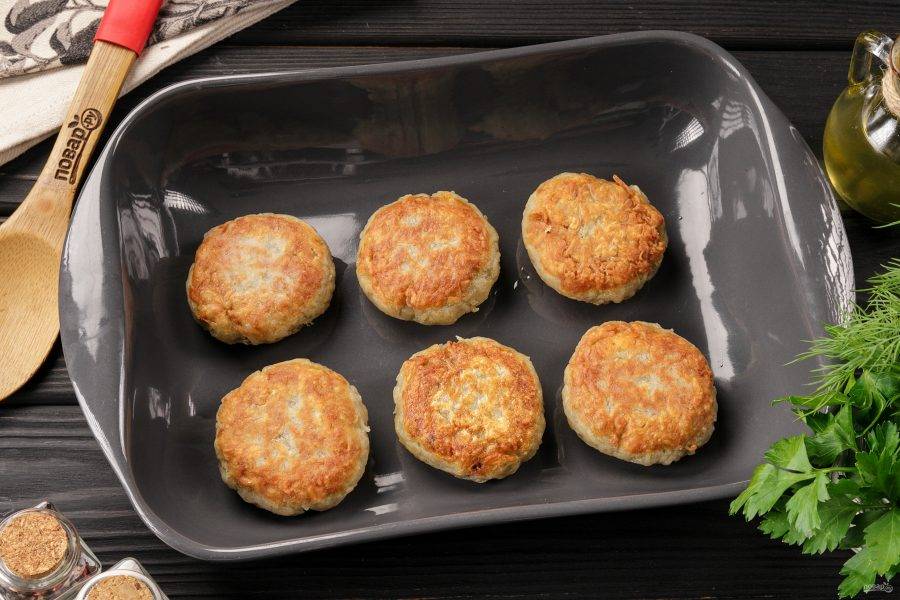 Таким же способом сформируйте котлеты из оставшихся ингредиентов. В сковороде разогрейте растительное масло, обжарьте в нем все заготовки с двух сторон до золотистой корочки на среднем огне.