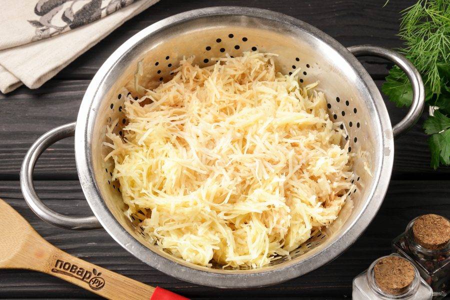Картофель натрите на терке с мелкими ячейками. С измельченного картофеля отожмите сок в отдельную посуду.