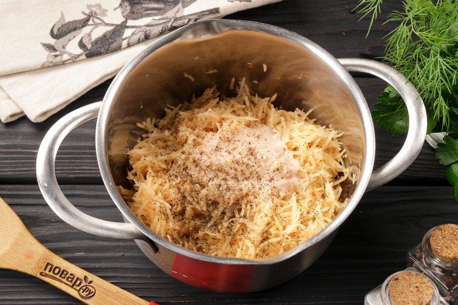 Слейте жидкость из миски, а оставшийся на дне картофельный крахмал отправьте назад в миску с натёртым картофелем. Добавьте соль, перец и перемешайте.