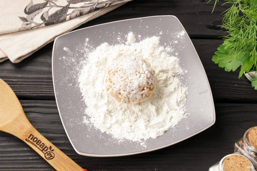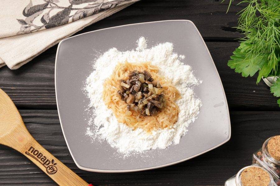 В тарелку с мукой выложите 1,5-2 ст. ложки картофельной массы в виде плоской лепёшки. В центр массы выложите начинку.