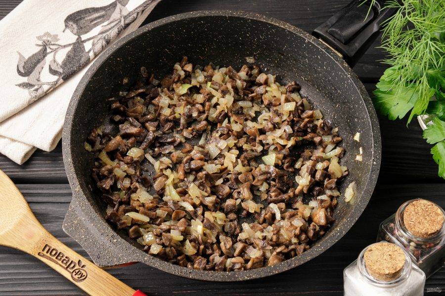 Шампиньоны нарежьте кубиками и обжарьте до испарения жидкости, затем добавьте нарезанный кубиками лук, 1-2 ложки растительного масла и продолжайте обжаривать всё вместе до мягкости лука. В конце добавьте соль и перец по вкусу.