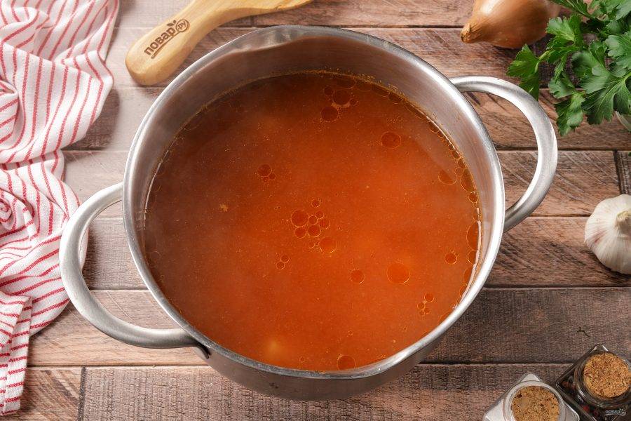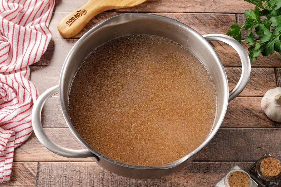 Влейте процеженный бульон и доведите до кипения.
