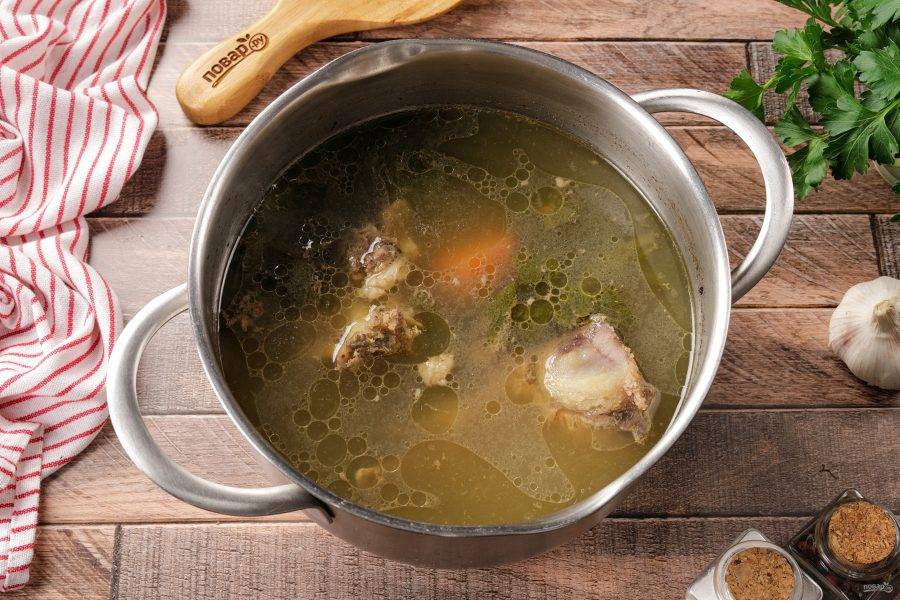 За 15-20 минут до окончания варки бульон можно посолить. Когда бульон будет готов, достаньте овощи и кости, а сам бульон процедите.