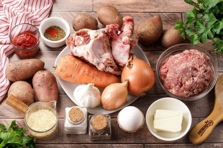 Подготовьте все ингредиенты по списку. Мясо промойте и обсушите. Срежьте мясо с кости и пропустите через мясорубку с крупной решёткой. Кости оставьте на бульон. Специи можете взять на свой вкус.