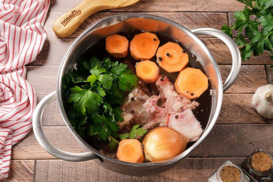 Переложите кости в кастрюлю и залейте водой. Морковь очистите и разрежьте на несколько частей. У лука снимите верхнюю шелуху и хорошо промойте. Добавьте в кастрюлю подготовленные овощи, перец горошком и петрушку. Петрушку лучше завязать в пучок, чтобы проще было потом вытащить её из бульона. Поставьте кастрюлю на плиту и доведите до кипения. Снимите пену и варите на самом минимальном огне около 2 часов.