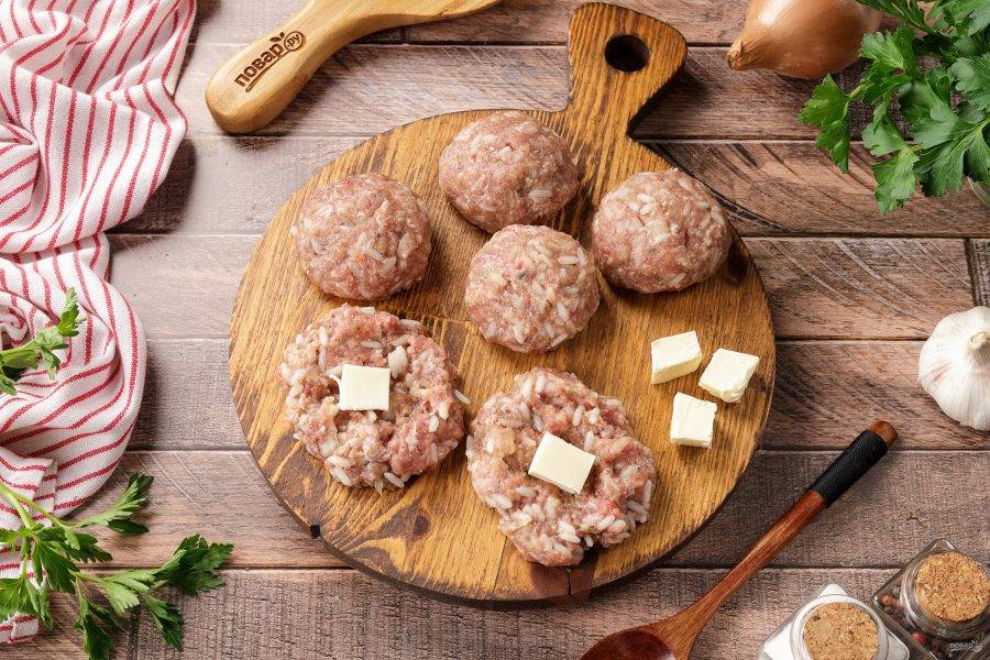 Сформируйте из фарша крупные фрикадельки, начиняя каждую кусочком сливочного масла.