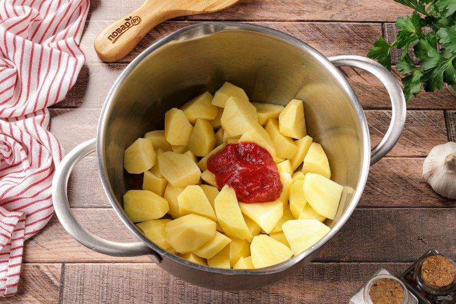 Картофель очистите и нарежьте крупными кубиками. Переложите в кастрюлю, добавив томатную пасту.