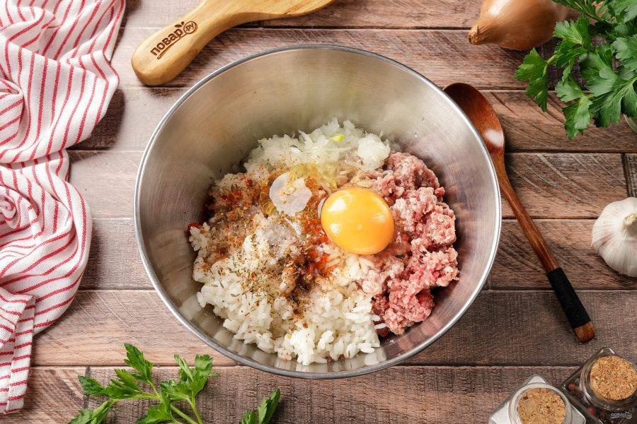 Пока варится бульон можно подготовить фарш для фрикаделек. Рис промойте и отварите в подсоленной воде почти до готовности. Переложите рис в глубокую миску, добавьте фарш, тёртый на тёрке или измельчённый на мясорубке лук, яйцо, соль и специи по вкусу. Тщательно перемешайте и уберите пока в холодильник.