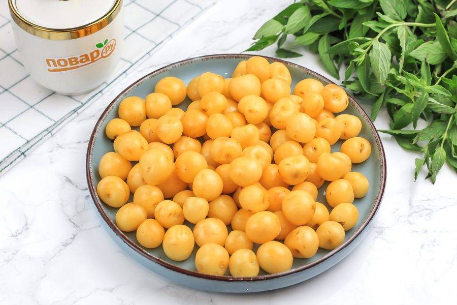 Подготовьте указанные ингредиенты. Переберите черешню, удаляя подпорченные ягоды.