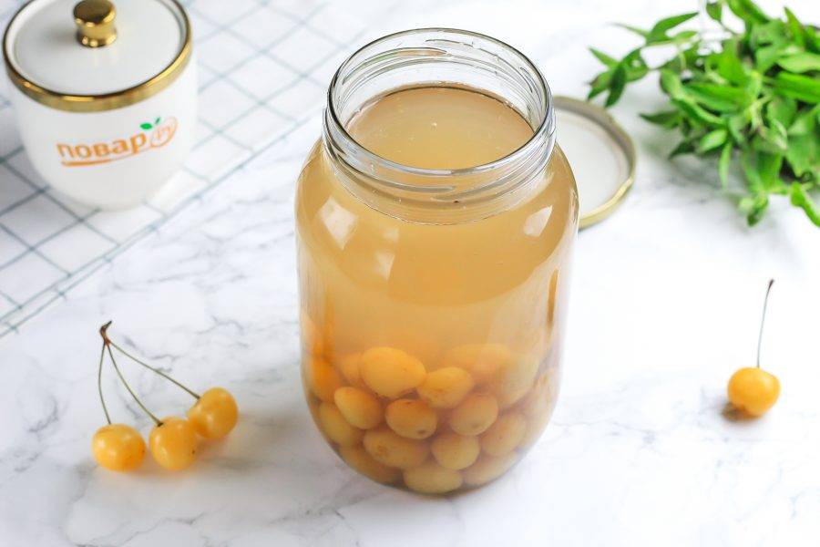 Закрутите крышку на банке и остудите емкость при комнатной температуре, а после перенесите в кладовую. Переворачивать банку не нужно! Срок годности компота из белой черешни — 1 год.