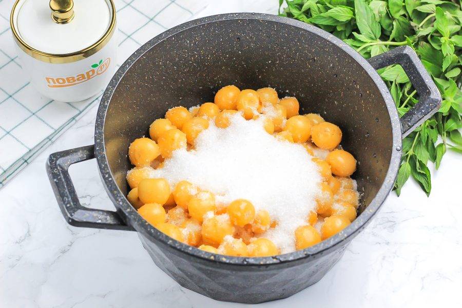 Пересыпьте черешню в казан или кастрюлю, добавьте сахарный песок и пару щепоток ванильного сахара.