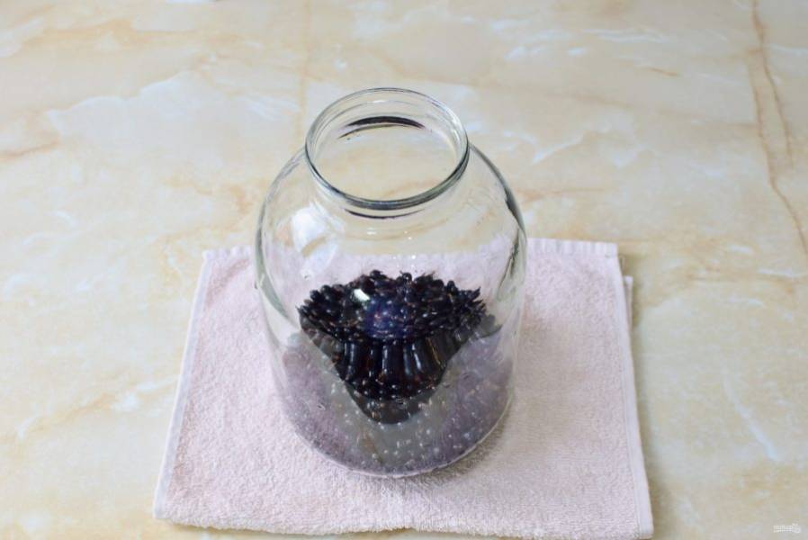 Банку на 3 литра помойте и ополосните очень теплой водой, чтобы она слегка прогрелась. Это необходимо длят ого, чтобы стекло не лопнуло при заливке кипятком. Ягоды выложите в банку.