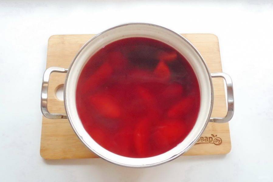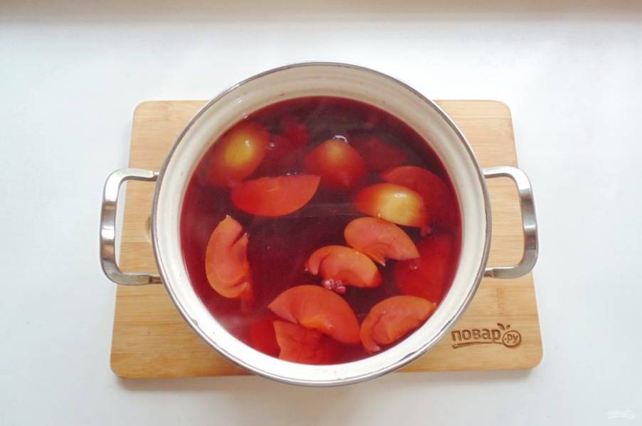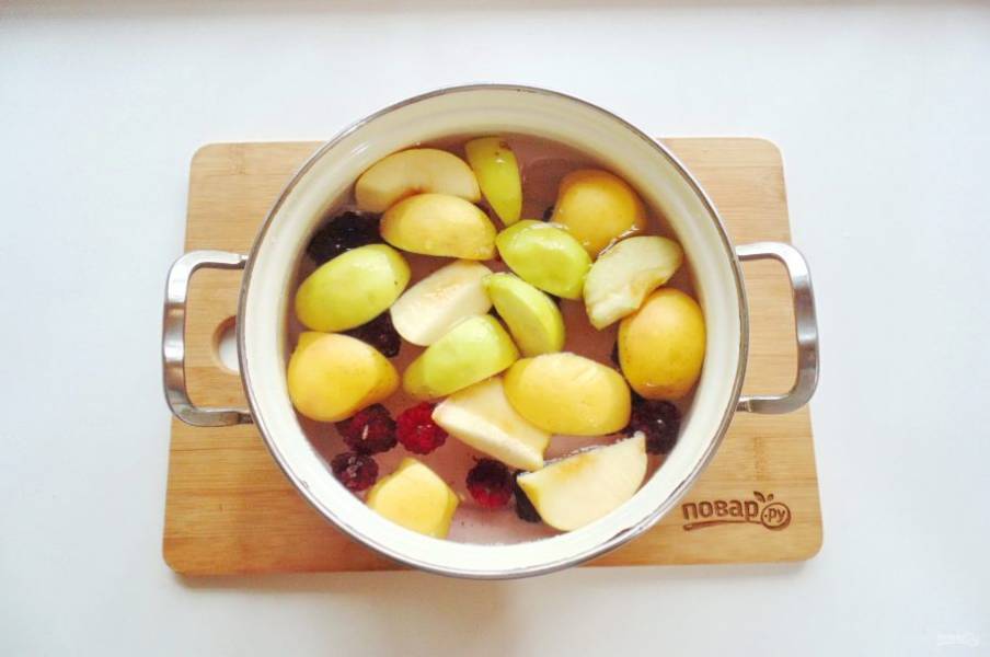 Яблоки помойте, разрежьте на несколько частей, удалите семенную коробочку. Выложите в кастрюлю.