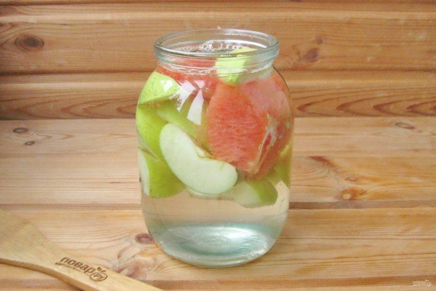 Пока закипает вода, всыпьте в банку сахар и лимонную кислоту. Залейте грейпфрут и яблоки закипевшей водой. Закройте крышкой и закатайте. Переверните вверх дном, укутайте в одеяло и дайте полностью остыть. Храните в прохладном месте.