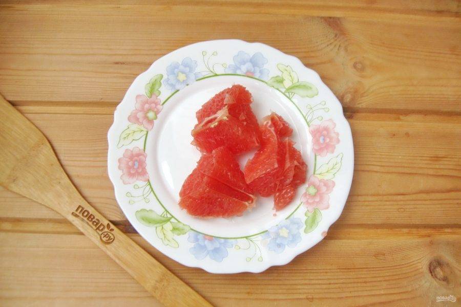 Грейпфрут очистите и по возможности, полностью удалите белую плёнку. Нарежьте кусочками.
