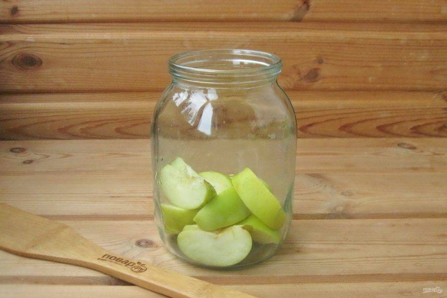 В стерилизованную банку выложите яблоки.