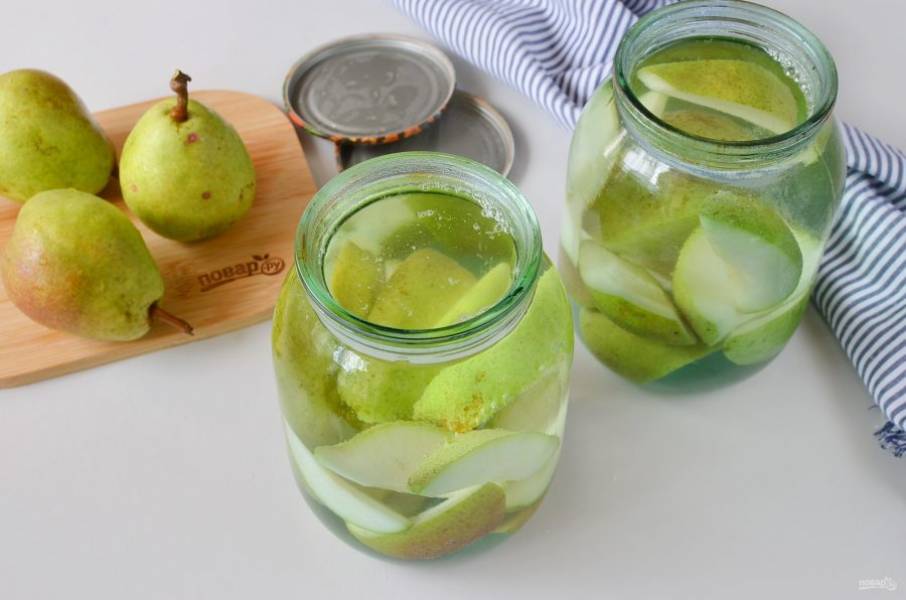 Доведите воду до кипения и снова залейте банки с грушами. Закатайте.
