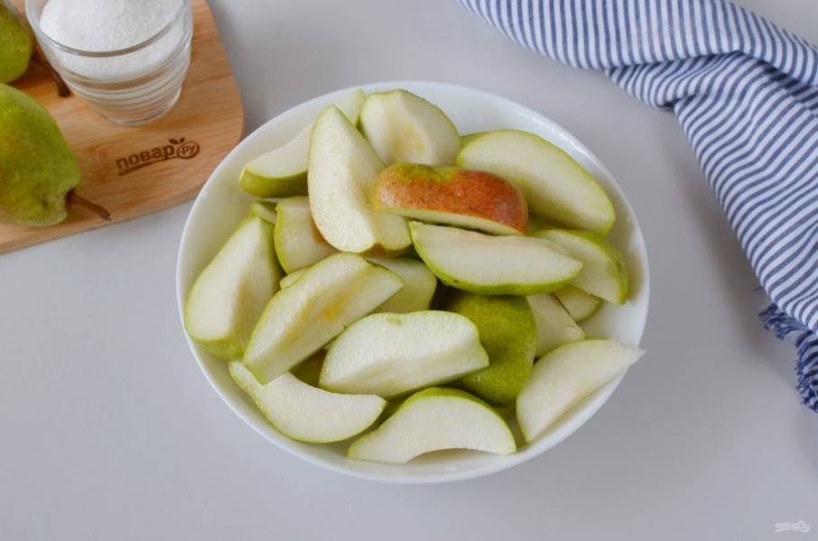 Груши тщательно вымойте, порежьте на четвертинки, удалите сердцевинки.