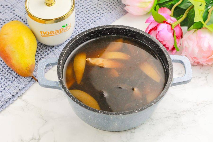 Влейте горячую воду и поместите емкость на плиту. Отварите компот в течение 20-25 минут, убавив нагрев до умеренного с момента закипания жидкости.