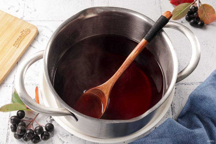 Далее всю жидкость из банок слейте в кастрюльку. Добавьте сахар, доведите до кипения и проварите буквально 1 минуту.