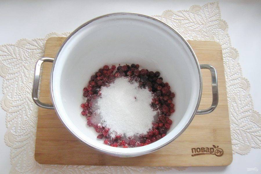 Насыпьте в кастрюлю сахар по вкусу, учитывая, что обе ягоды очень кислые.