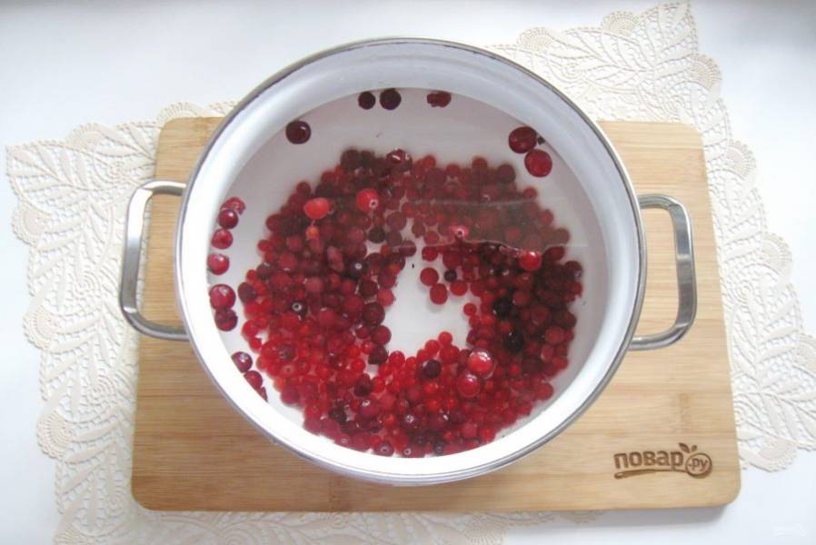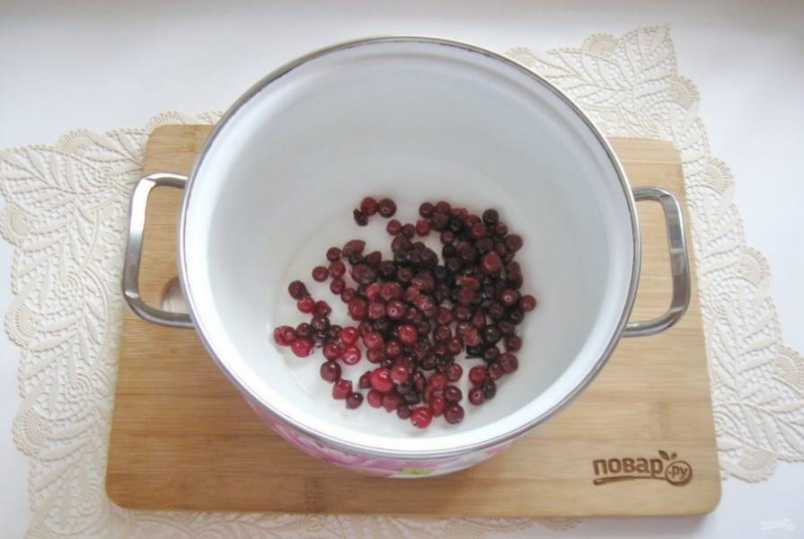 Клюкву промойте в проточной воде и выложите в кастрюлю.