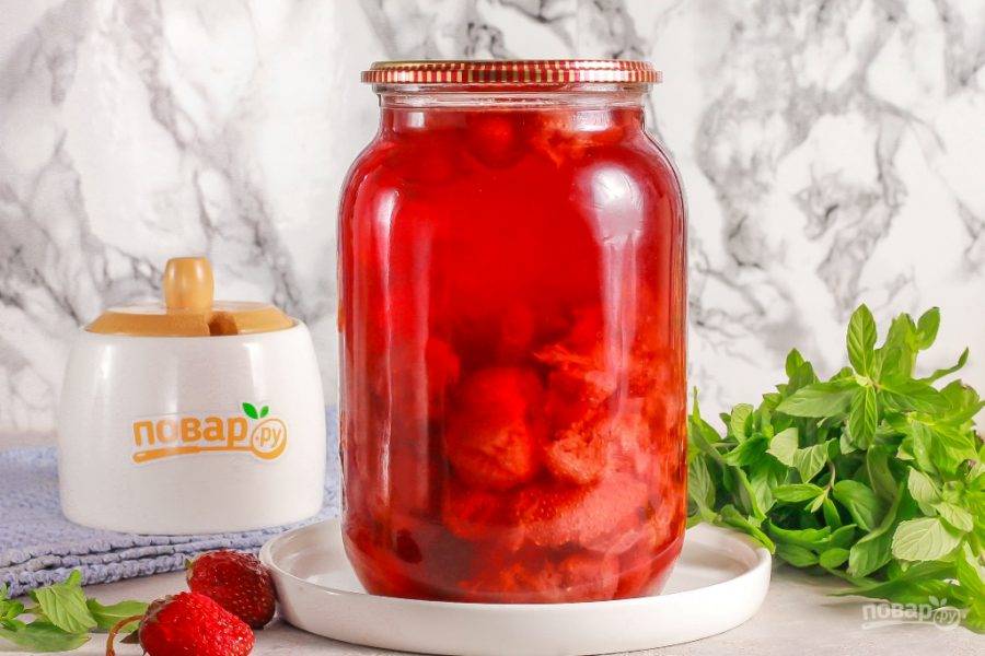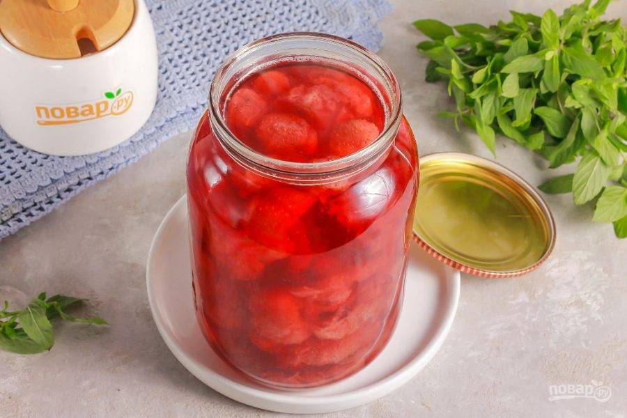 Ошпарьте банку и крышку кипятком или заранее пропарьте их на водяной бане. Перелейте клубничный компот в банку и сразу же закупорьте ее твист крышкой или жестяной крышкой с помощью ключа для консервации.