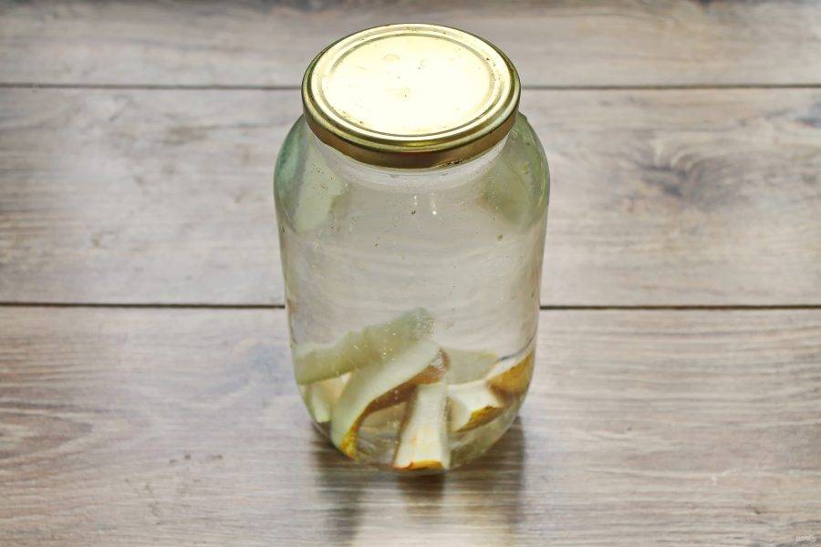 Воду доведите до кипения и вылейте в банку с грушами. Накройте банку крышкой и дайте постоять в течение 10 минут.