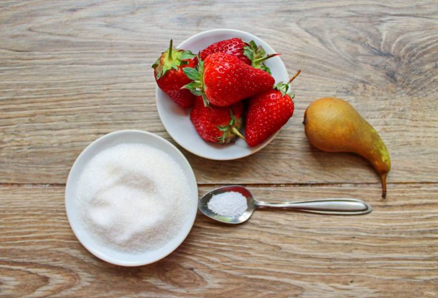 Подготовьте все необходимые ингредиенты для приготовления компота из клубники и груши. Ягоды переберите, сполосните и дайте воде полностью стечь. Грушу вымойте и обсушите.