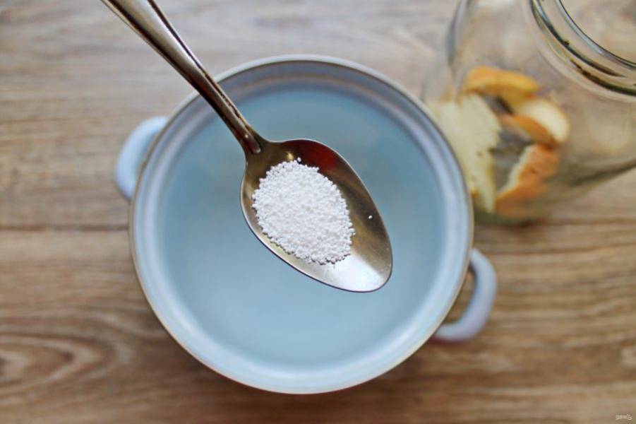 Слейте воду из банки в кастрюлю и добавьте лимонную кислоту.