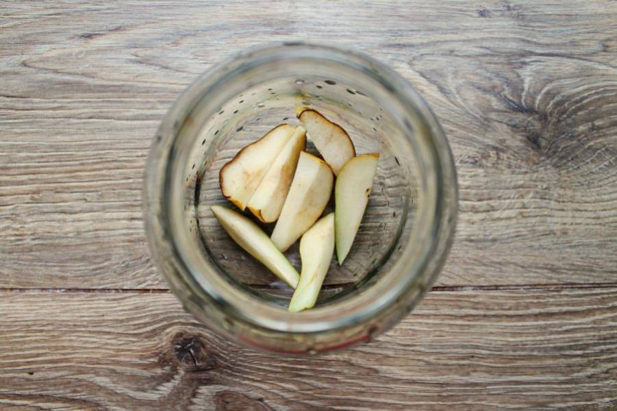 Грушу разрежьте на дольки и удалите сердцевину. Выложите дольки груши в стерилизованную банку.