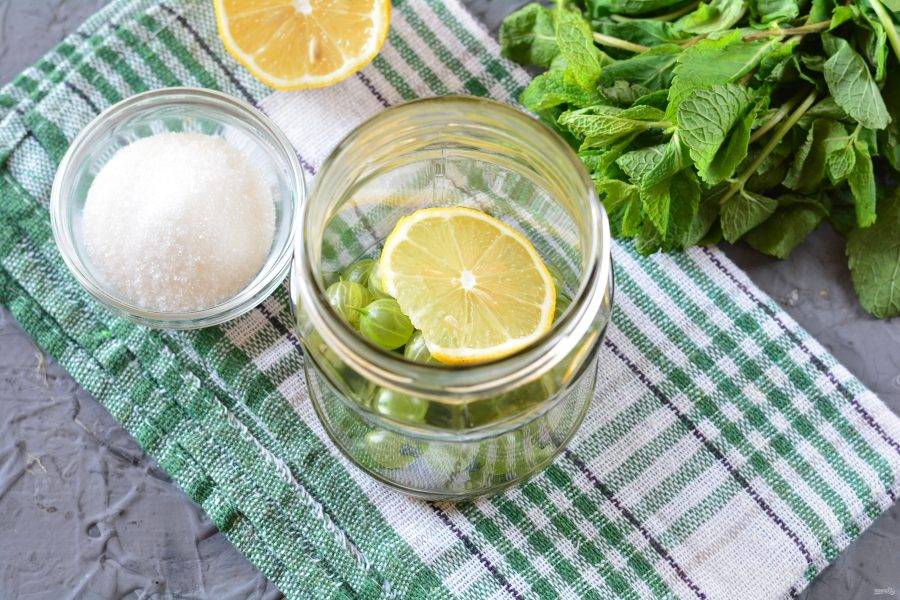 На дно простерилизованной банки выложите вымытый крыжовник и кусочки лимона.