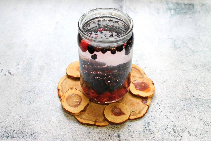 Воду доведите до кипения и залейте ягоды до верха. Прикройте сверху чистой крышкой и оставьте на 15 минут.