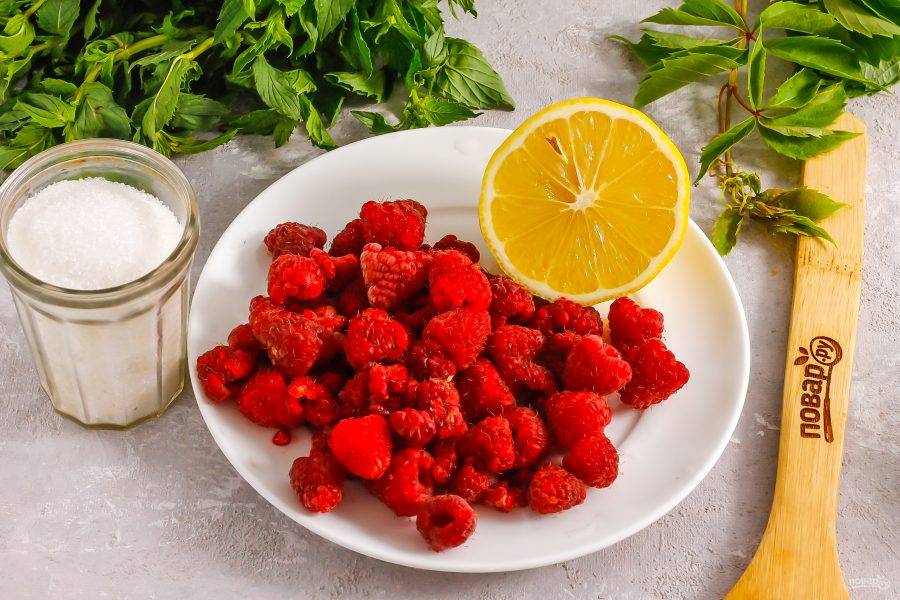 Промойте мяту в воде, оборвите листочки со стеблей. Малину тоже промойте в воде, удаляя подпорченные ягодки, если они присутствуют.