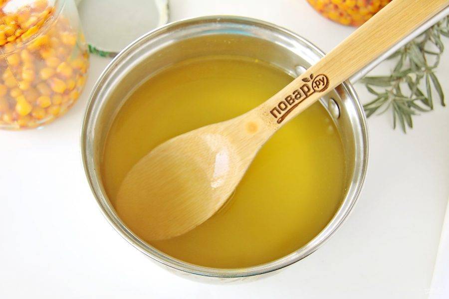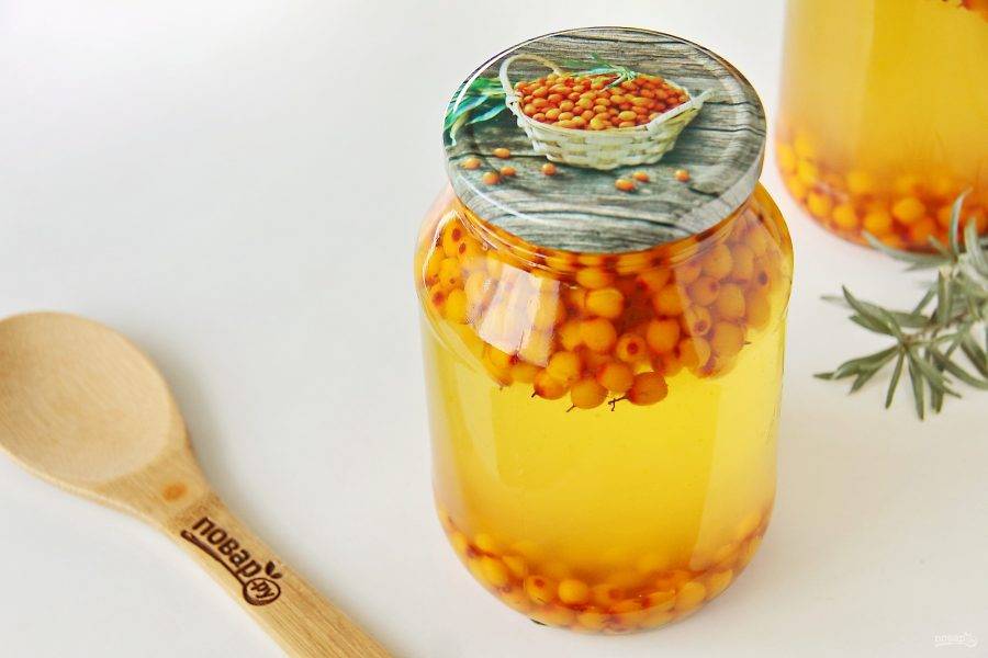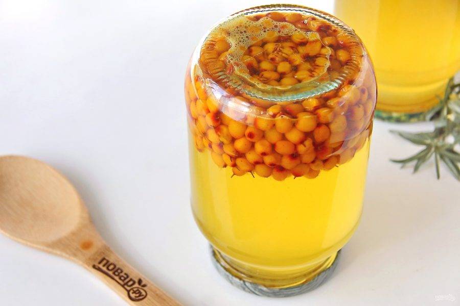 Полученным сиропом снова залейте ягоды и закрутите банки стерильными крышками. Переверните банки донышком вверх, укутайте и оставьте до остывания, после чего храните готовый компот из облепихи в прохладном месте.