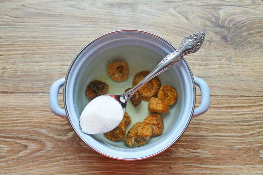 Налейте в кастрюлю воду и доведите до кипения на среднем огне. Инжир сполосните и выложите в кастрюлю, добавьте сахар.
