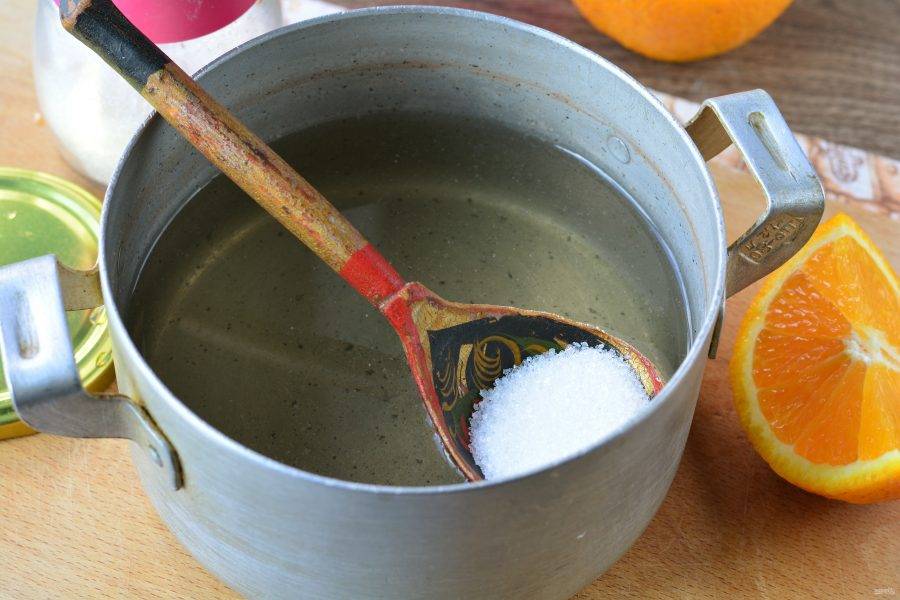 Затем слейте горячую воду в кастрюлю, всыпьте сахар, вскипятите и варите 2 минуты.