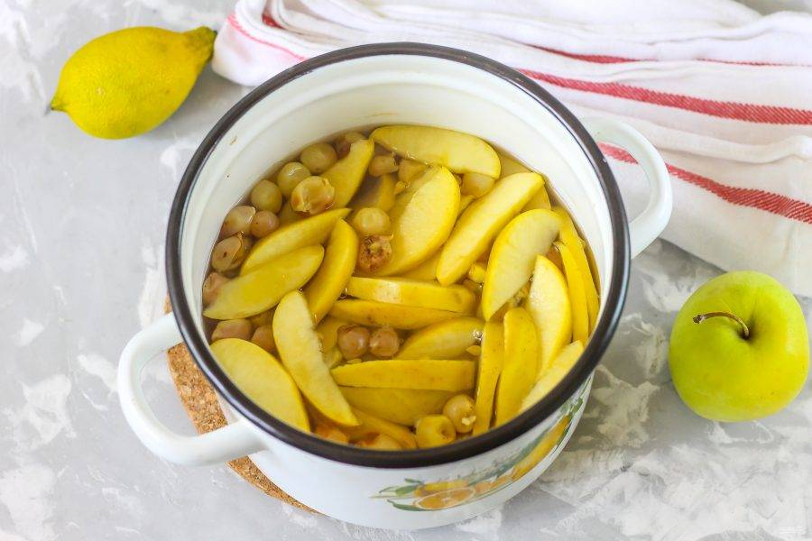 Поместите кастрюлю на плиту и отварите компот в течение 15-20 минут до мягкости яблочной нарезки.